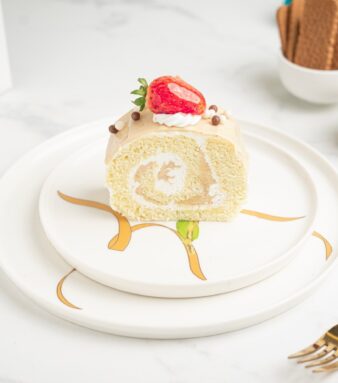 A double layer chocolate cake base, lightly covered with a mango